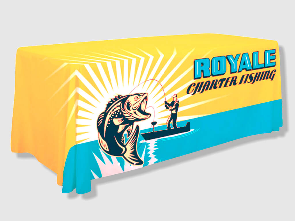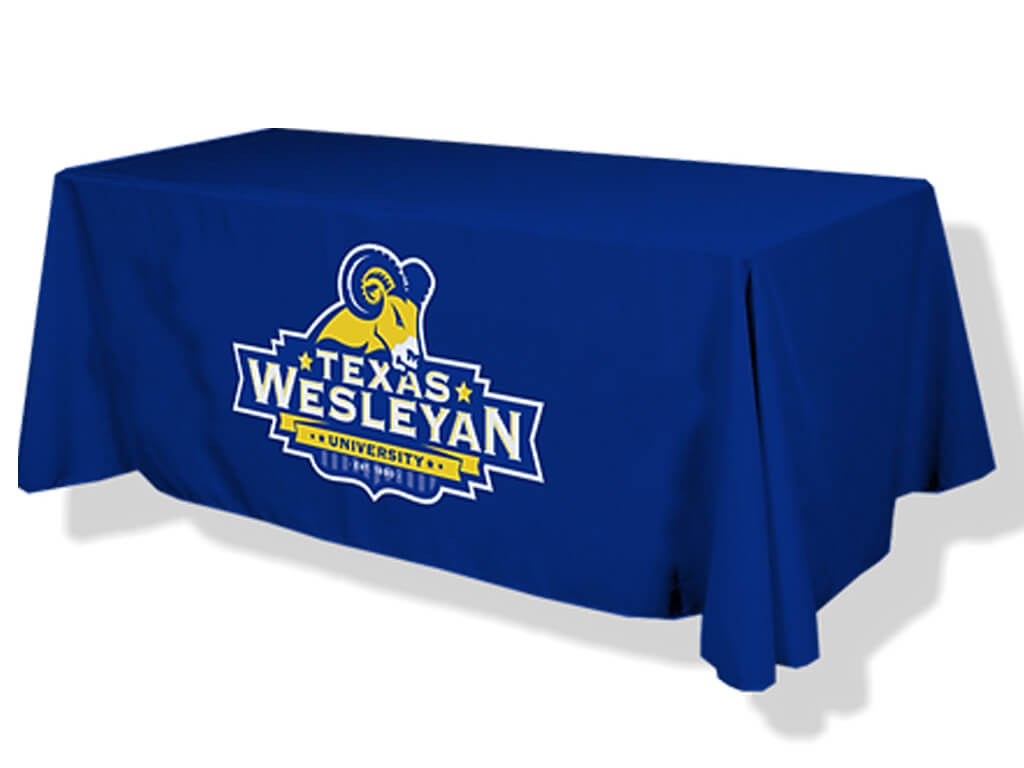Our standard 4 sided table cover is a great table topper for trade shows, exhibitions, and any presentations. Our table covers are dye sublimated and are 100% washable. This table cover is made of 8.8 oz. polyester table fabric with rounded corners and hangs approximately 2″ above the floor. This material drapes over 4 sides of a 96″ x 30″ x 30″ display table. Complete your presentation with our simple and cost-effective table cover.